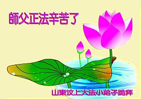 師父辛苦了!法輪大法純正的法理改變了弟子,大法不僅健康了弟子的身體,更讓弟子明白了人為何來到了世間和來到世間的真正意義是返本歸真,在修好自己的同時助師正法,救度被迷失的眾生,弟子感覺自己每天都活得很充實、很幸福,這都是偉大的師尊對弟子的偏愛,弟子一定把大法的福音傳給更多的世人,讓更多的生命也沐浴在師尊慈悲偉大的佛光裡!