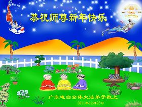 【大紀元2012年01月01日訊】自二零零二年開始,世界各地的大法弟子紛紛在新的一年到來之際,將發自內心的節日賀詞、詩歌、自製的賀卡等寄給明慧網,恭祝慈悲偉大的師尊元旦快樂,感謝師尊的救度之恩,同時表示要真正按照師尊的教導,時時把自己當作一個大法弟子,學好法,遇事向內找,相互配合好,助師正法,救度眾生。以下是二零一二年元旦之際各地大法弟子寄來的賀卡精選。
