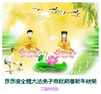 師父新年快樂!弟子們在新的一年裡要更加精進、實修自己,去掉各種執著、不好的思想、不好的觀念,勇猛精進除邪靈,純純淨淨多救人,兌現自己的史前誓約。