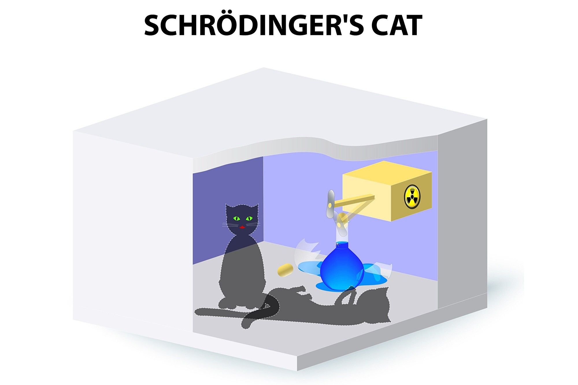 「薛定諤貓」(Schrodinger’s cat)是一個用於描述量子疊加狀態的著名思想實驗。把一隻貓、一個裝有氰化氫毒氣的玻璃瓶和放射性物質放進封閉的盒子裡。當盒子內的監控器偵測到衰變粒子時,就會打破玻璃瓶釋放毒氣殺死這只貓。根據量子力學的哥本哈根詮釋,在盒子打開之前,貓處於一種又活又死的疊加態。