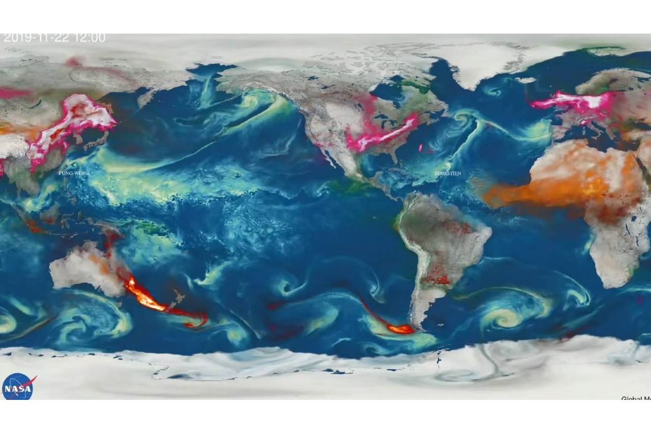 視頻中使用不同顏色代表空氣中不同的氣溶膠顆粒,展示了2019年8月至2020年1月間這些煙霧在世界各地的濃度和分布情況。