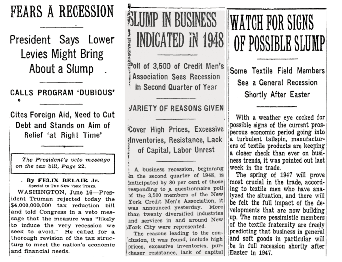 從1945年到1947年,報刊和學術討論中不斷出現對經濟衰退的擔憂。《紐約時報》(The New York Times)等報紙頻頻發出警告。