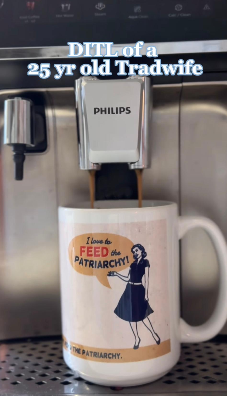 她爐子上方的牌子上自豪地寫著:「我喜歡為家庭中的男性領導者做飯。」