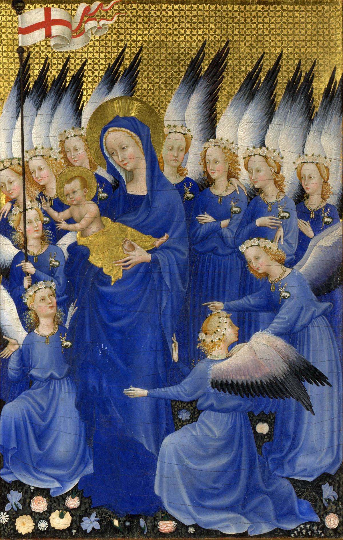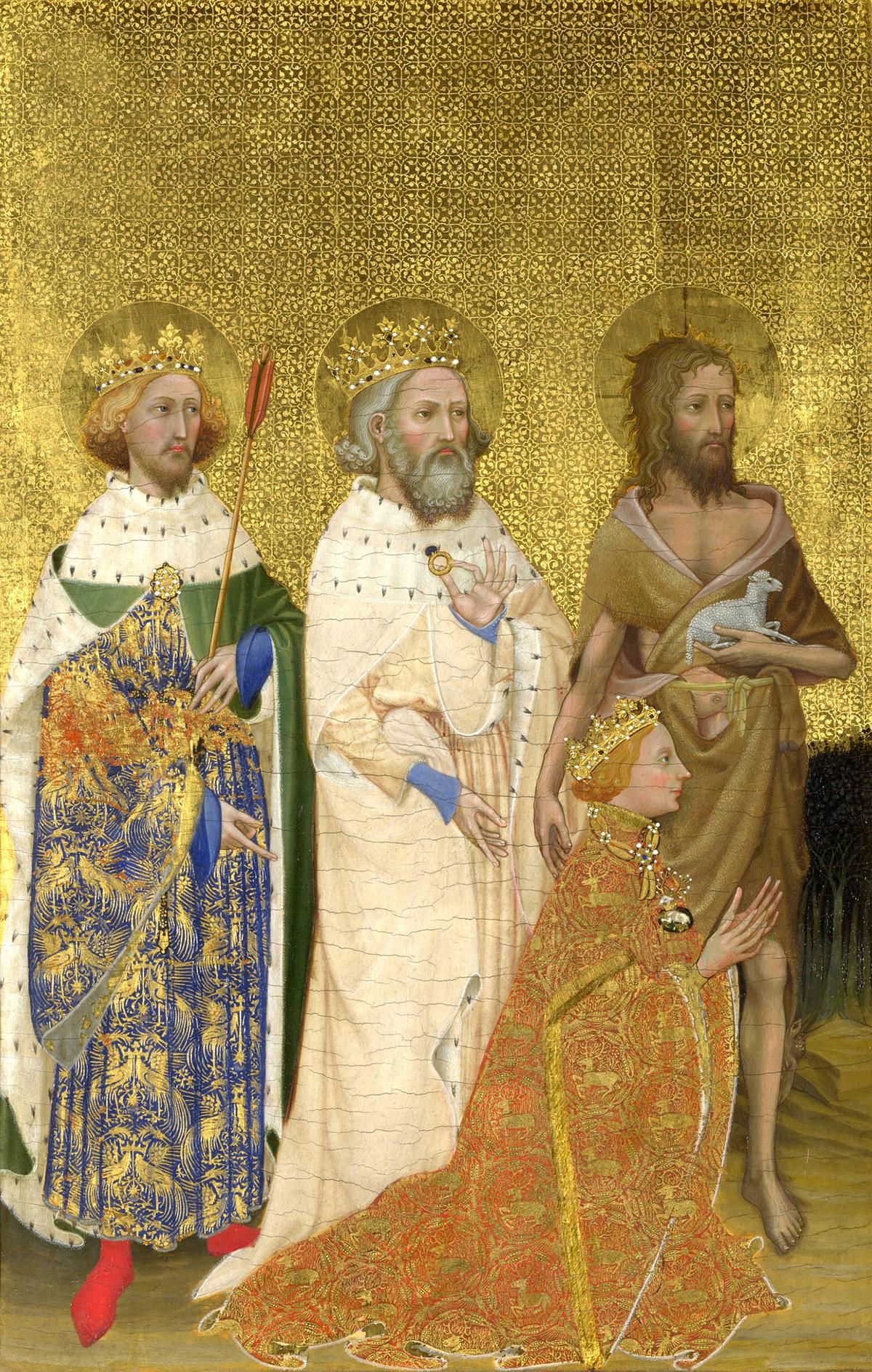 [點擊這裡看圖片:佚名英國或法國畫家,《主保聖人施洗者約翰、愛德華與愛德蒙引領理查二世朝拜聖母與聖嬰》(Richard II presented to the Virgin and Child by his Patron Saint John the Baptist and Saints Edward and Edmund),即《威爾頓雙聯畫》(The Wilton Diptych),約1395~1399年創作,面板蛋彩畫,倫敦國家美術館藏。]