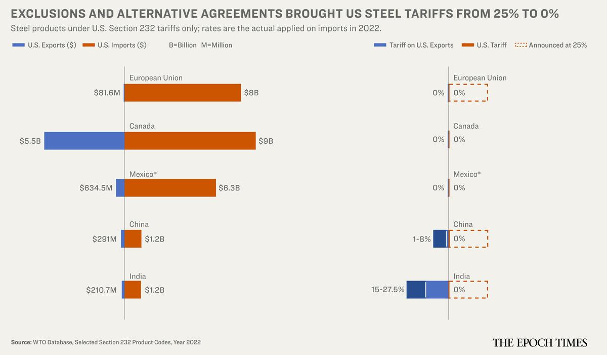 世貿組織(WTO)發布的貿易數據顯示,根據第232條款,美國對來自歐盟、中國、日本和印度等主要產地的進口鋼鐵徵收的實際關稅幾乎為零。