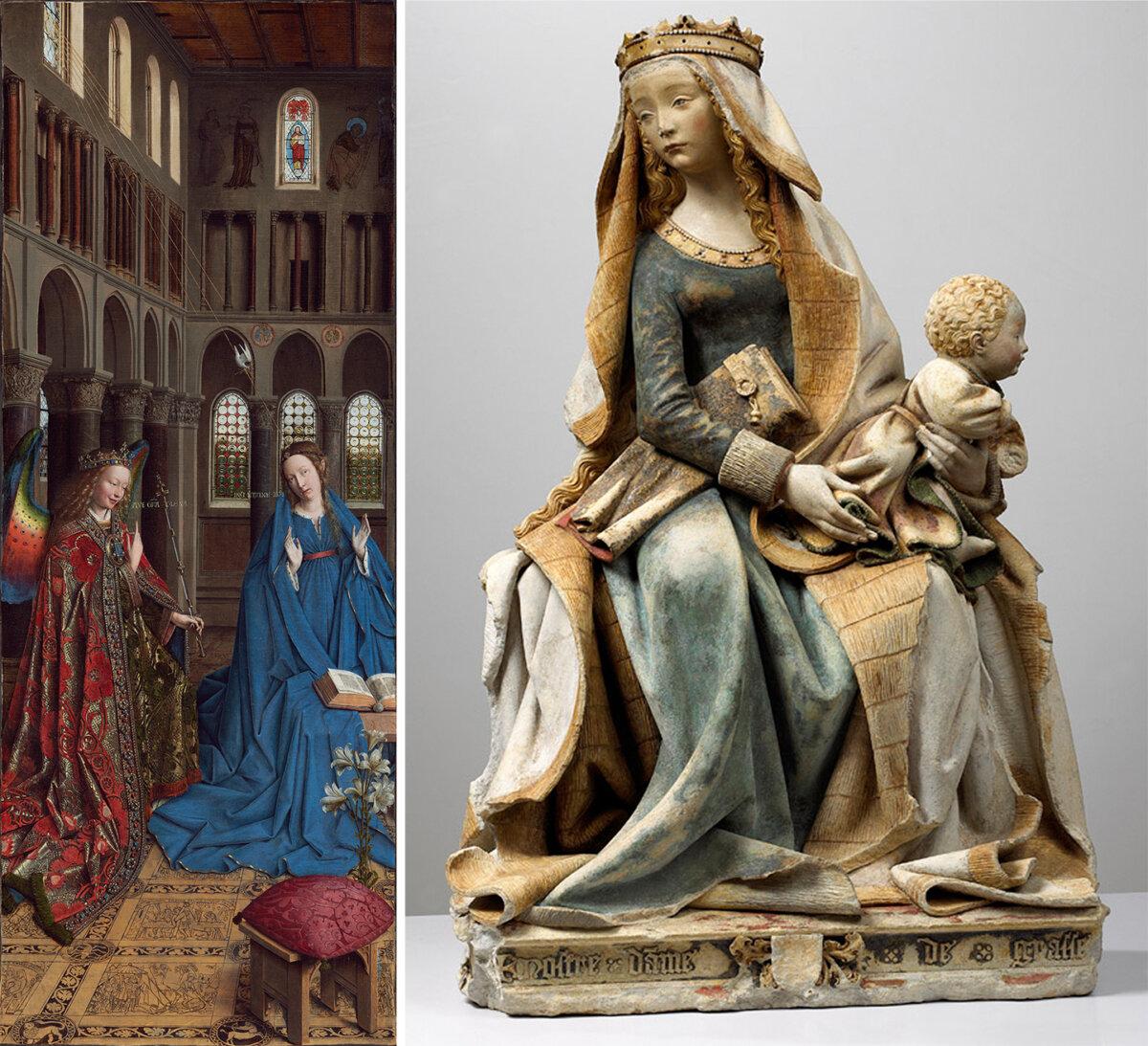 [▶點擊這裡看圖片:左圖,揚‧范艾克(Jan van Eyck)約於1434–1436年間所作《聖母領報》(The Annunciation),面板油畫(後轉移至畫布),美國華盛頓國家藝術館藏。右圖,佚名藝術家約於1460–1500年間所作《恩寵聖母》(Nostre Dame de Grasse),石灰岩著色雕塑,法國圖盧茲奧古斯丁博物館藏。]