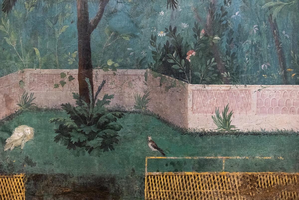 走入古羅馬莉薇婭王后(Empress Livia)的夏日三臥式餐廳(triclinium),如同踏入一座經過精心策劃的林間祕境。四面牆壁皆繪有擬真的壁畫,描繪出籬笆與石欄外一片野性蔥鬱的林地。這種無序與有序——自然的奔放與文明的克制間的平衡,正是藝術家的用意,象徵自然世界與羅馬帝國在共同治理下的諧調統一。