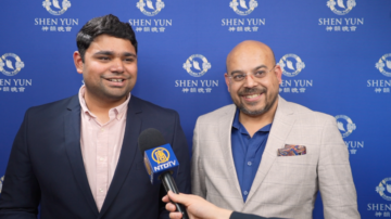 他笑着说:“我喜欢担任神韵晚会的那两位主持人,在解说的时候那位男主持还说了些中文,非常幽默生动。”