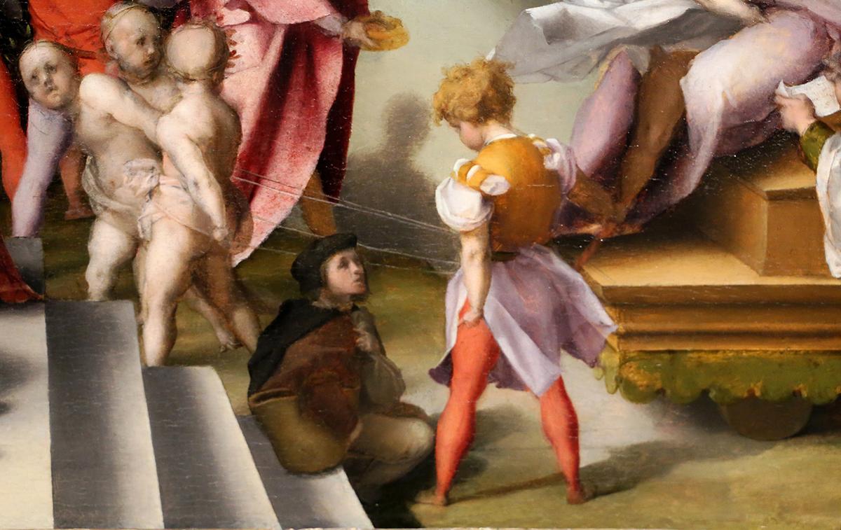 除了向米开朗基罗致敬之外,这幅作品也体现艺术传承的血统。画里描绘的人物中据信就有彭托莫的学生阿尼奥洛‧布龙齐诺(Agnolo Bronzino),后来他成为一位著名的风格主义画家。前景中,年轻的布龙齐诺坐在法老王宫殿最底层的台阶上,戴着黑色帽子,一只手臂搭在篮子上。