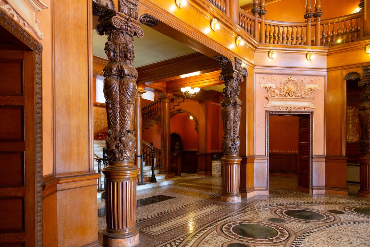 步入现今的学院大厅,映入眼帘的是多种材质错落交叠的视觉飨宴:努米底亚粉红大理石与抛光橡木护墙板装饰着墙面,入口两侧矗立着手工雕刻的女像柱(身披长袍的希腊女性雕像),地面铺设的是意大利式马赛克磁砖。楼梯、门框及二楼的开放式露台,皆可看到在此空间展现的橡木雕刻工艺。
