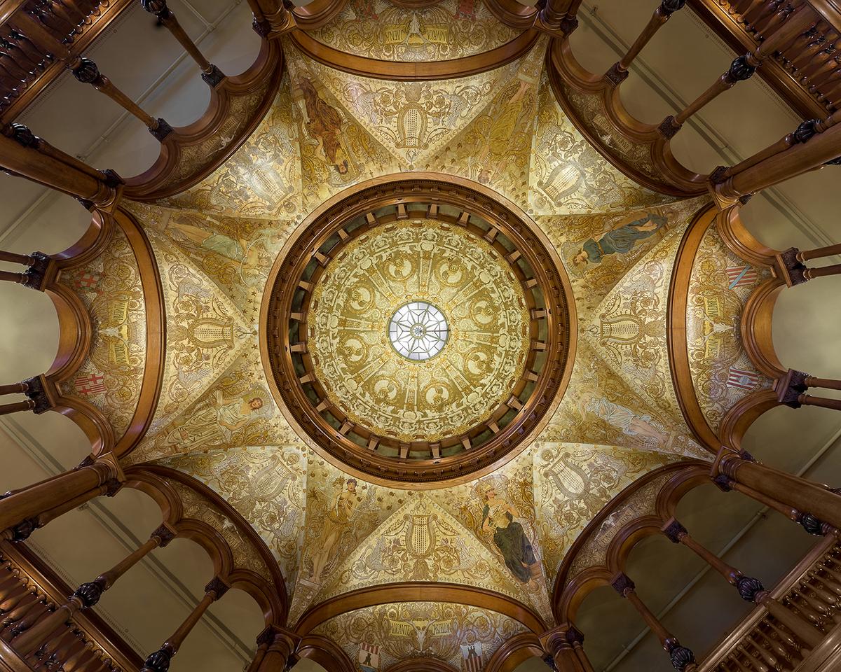 每位步入弗拉格勒学院大厅的人,都会抬头仰望:那座令人惊叹的八角形中央穹顶高达二十余米,四周环绕着纤细的橡木雕花立柱。圆形大厅天顶上的金色调壁画(画于画布上),出自意大利裔画家维吉利奥‧托杰蒂(Virgilio Tojetti)与美国画家乔治‧梅纳德(George Maynard)之手。壁画中细腻地描绘了衣褶垂坠的希腊人物(女像柱)、巨大的里拉琴,以及其它具有希腊风格的元素。